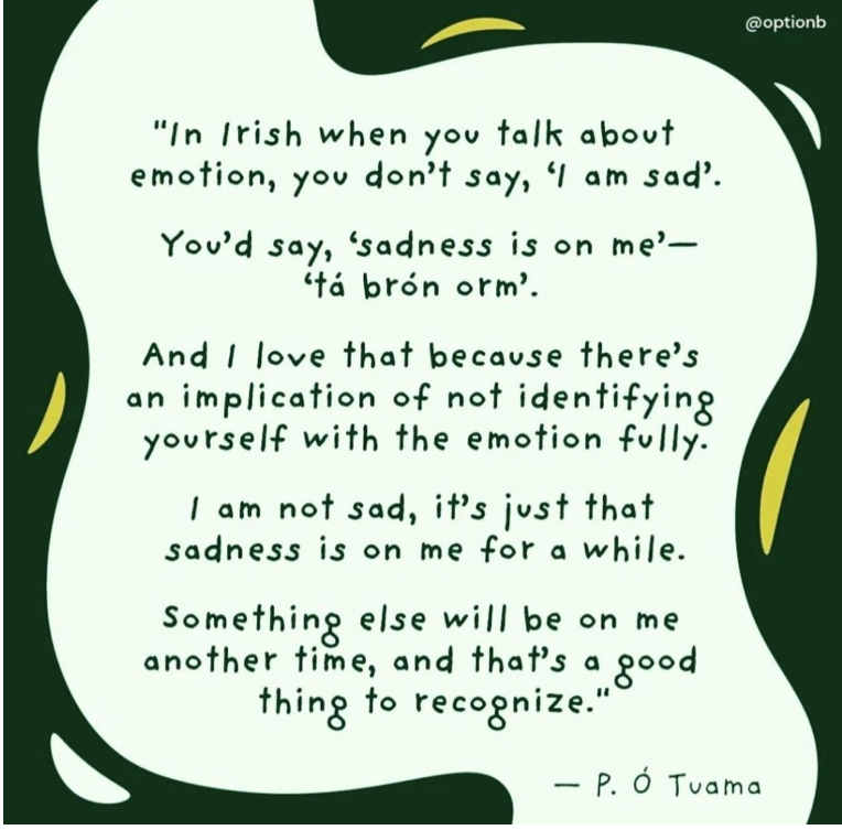 I love the Irish language and it’s always been a regret of mine that I was never fluent in Irish. Having lived in London until I was 9 meant that I was always playing catch-up with Irish. Plus living near the Gaeltacht but not living in the Gaeltacht meant that I wasn’t immersed in it in the way that I would have liked. I love the way we say ‘Ta bron orm’- which in English means ‘sadness is on me’. It’s such a beautiful way to say it. Sadness is on me. But it is not all of me.